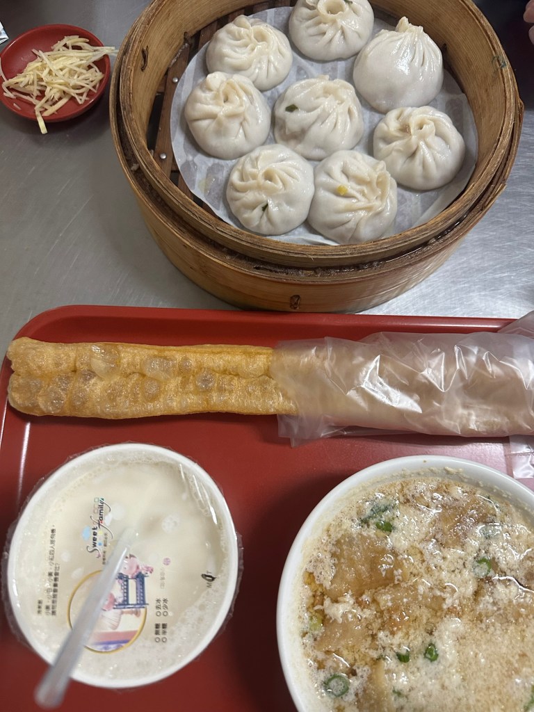 Savory soy milk is curdled and has green onions and other savory notes. It’s typically eaten with fried donuts. We had xiao long bao as well with silky smooth wrappers. The savory soy milk was delicious!! I am curious to see if I can recreate it at home, as it was the perfect breakfast.